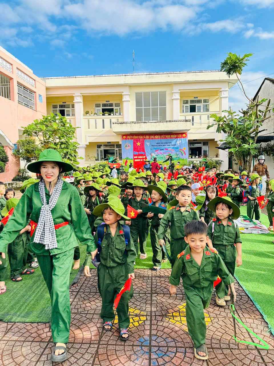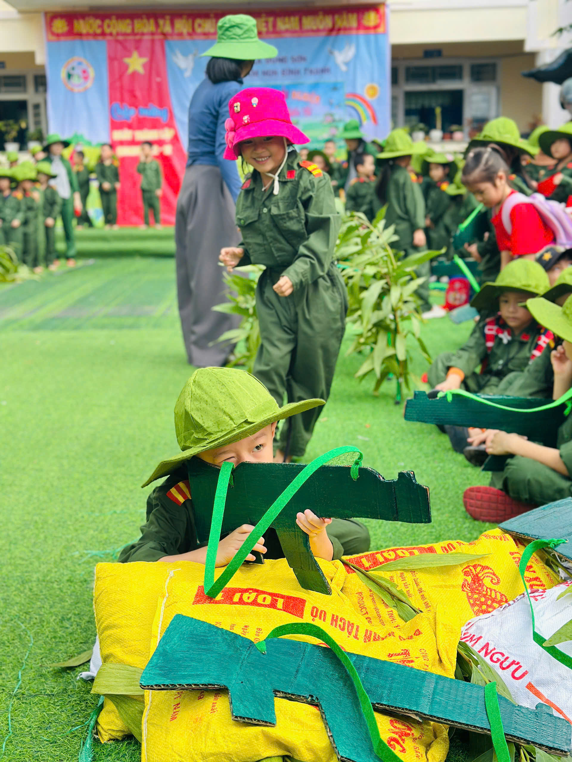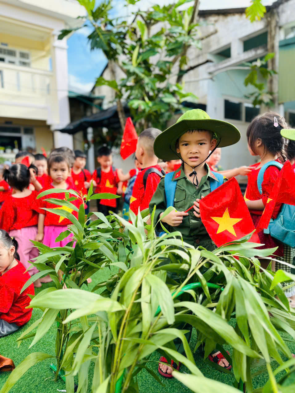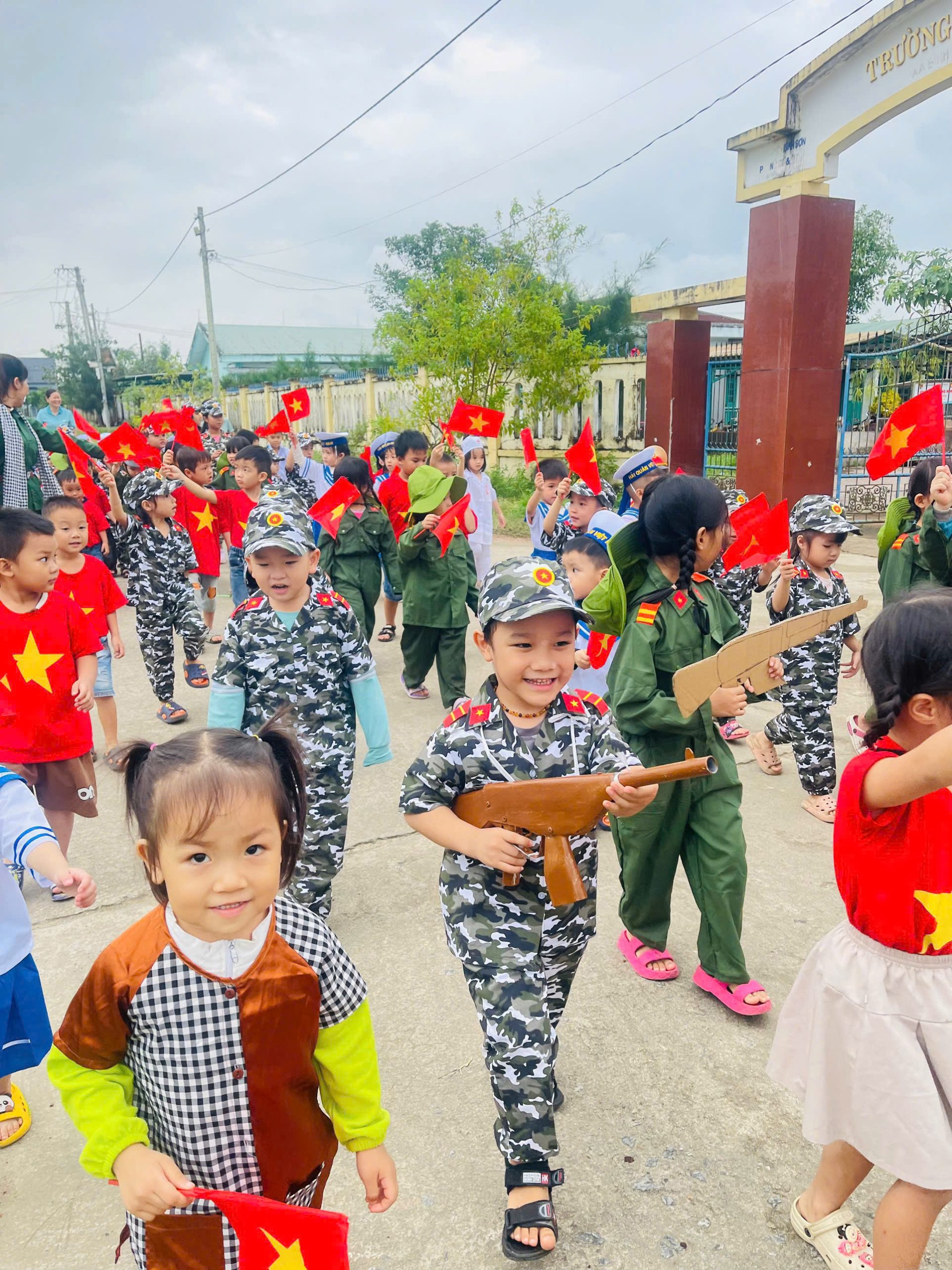 👧Khoác lên mình sắc xanh bộ đội thân quen, các bé hào hứng nhập vai những chiến sĩ tí hon. Từng bước chân hành quân ngộ nghĩnh, từng lời ca trong trẻo vang lên giữa sân trường đã vẽ nên một bức tranh sinh động, ngập tràn niềm vui, sự ấm áp và cảm xúc hồn nhiên của tuổi thơ