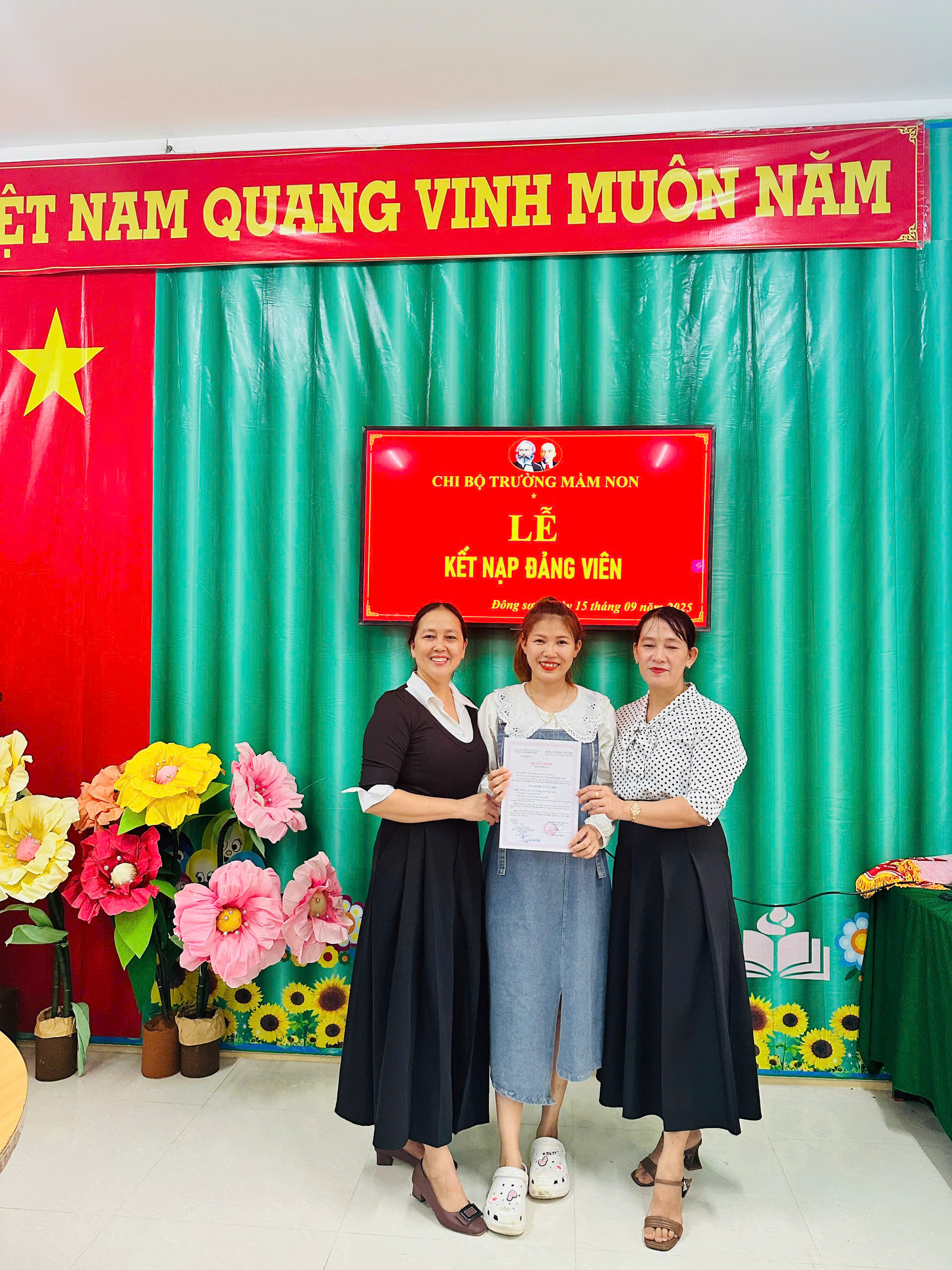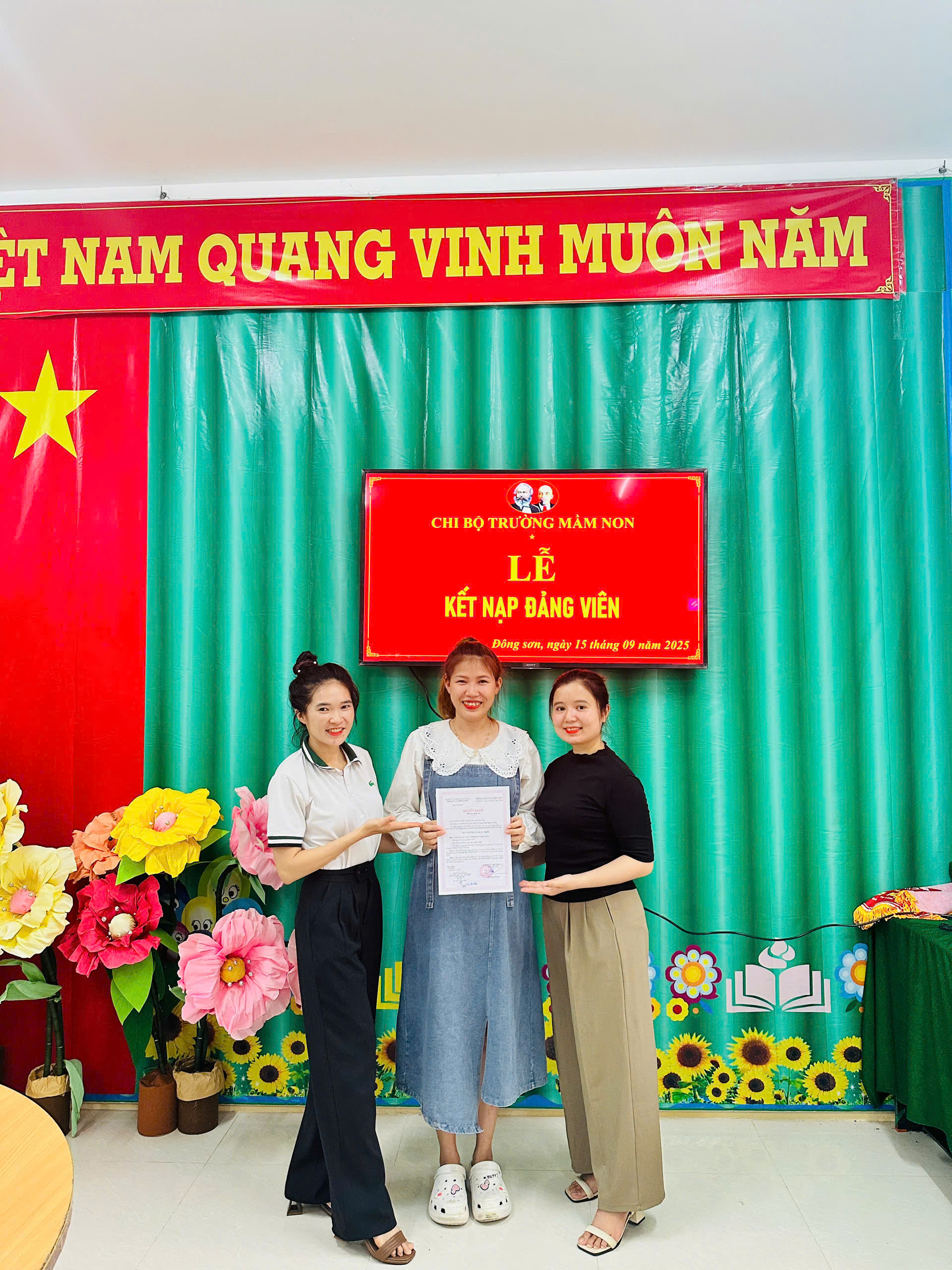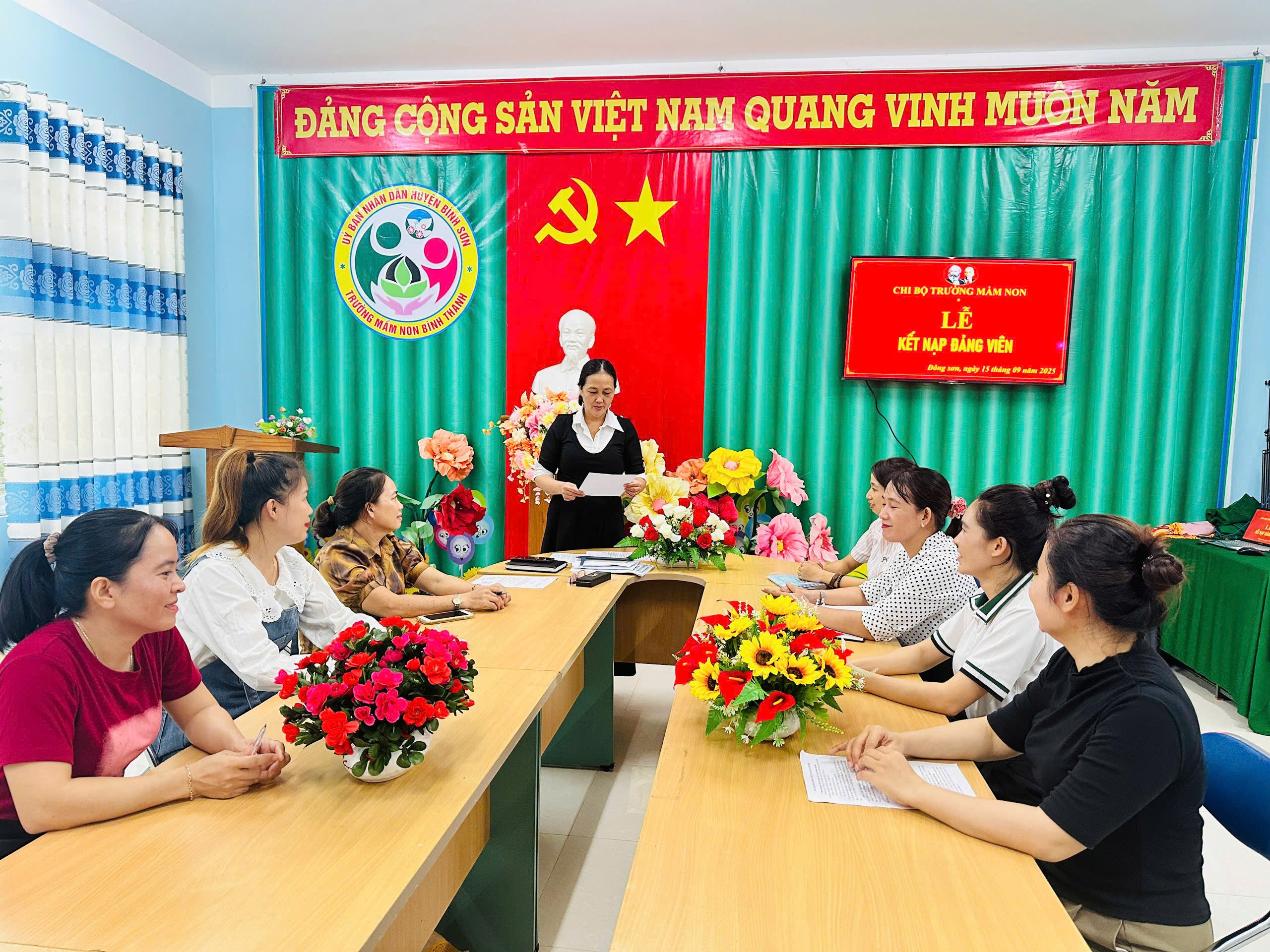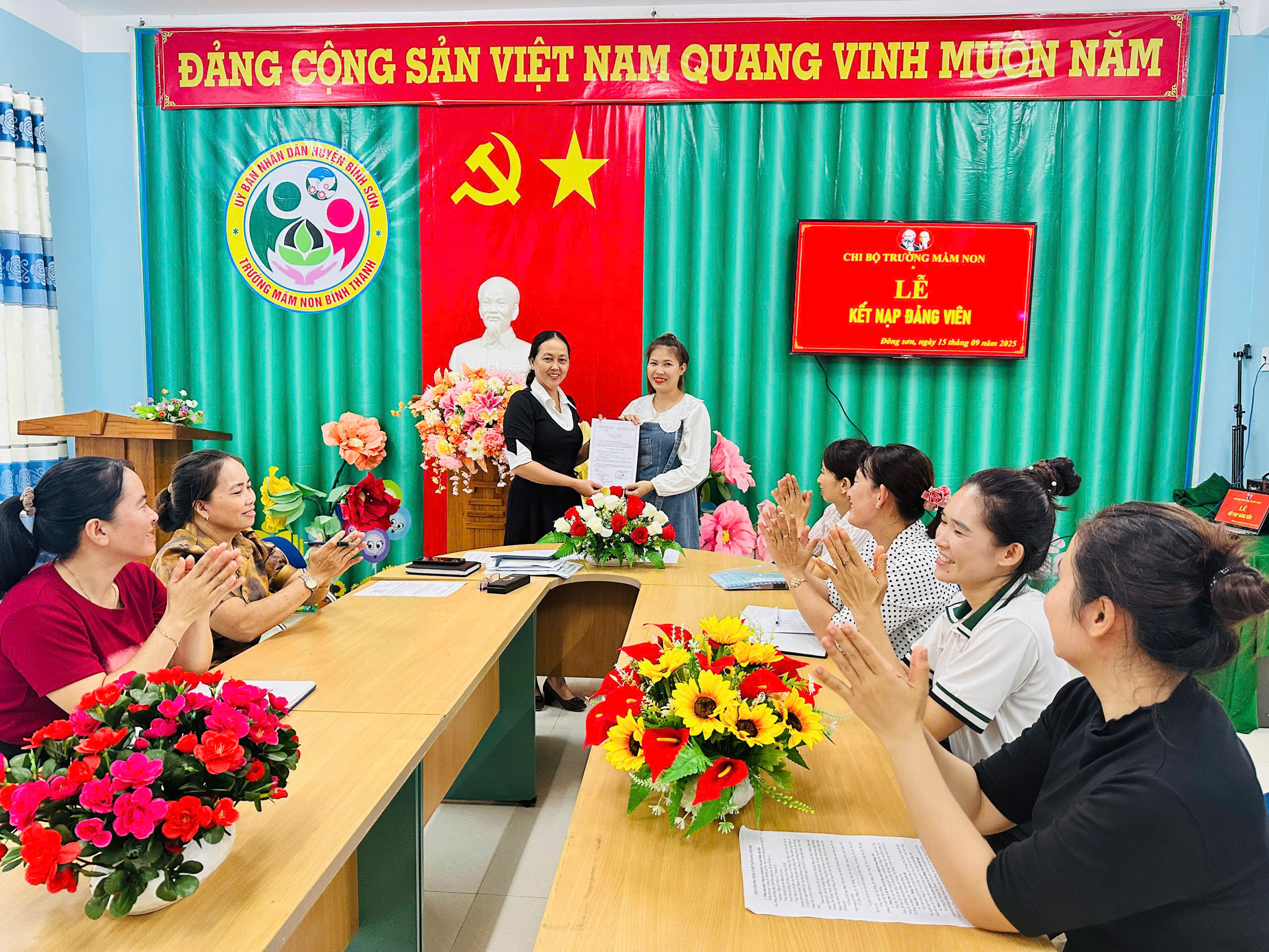 Thực hiện sự chỉ đạo của Đảng ủy xã Đông Sơn, Nghị quyết Đại hội chi bộ Trường Mầm non Bình Thanh về công tác phát triển Đảng viên; căn cứ Quyết định số 23-QĐ/ĐU ngày 09/9/2025 của Ban Thường vụ Đảng ủy xã Đông Sơn về việc kết nạp đảng viên và Quyết định số 24-QĐ/ĐU ngày 09/9/2025 về việc công nhận đảng viên chính thức.