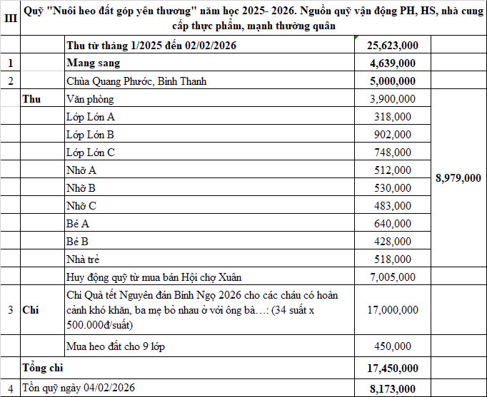 Trường Mầm non Bình Thanh xin trân trọng cảm ơn sự đồng hành, ủng hộ của quý phụ huynh, các mạnh thường quân và đặc biệt là Chùa Quang Phước đã luôn quan tâm, hỗ trợ nhà trường trong các hoạt động ý nghĩa. Nhà trường sẽ tiếp tục duy trì và phát huy những hoạt động nhân ái, góp phần chăm lo tốt hơn cho các cháu học sinh.